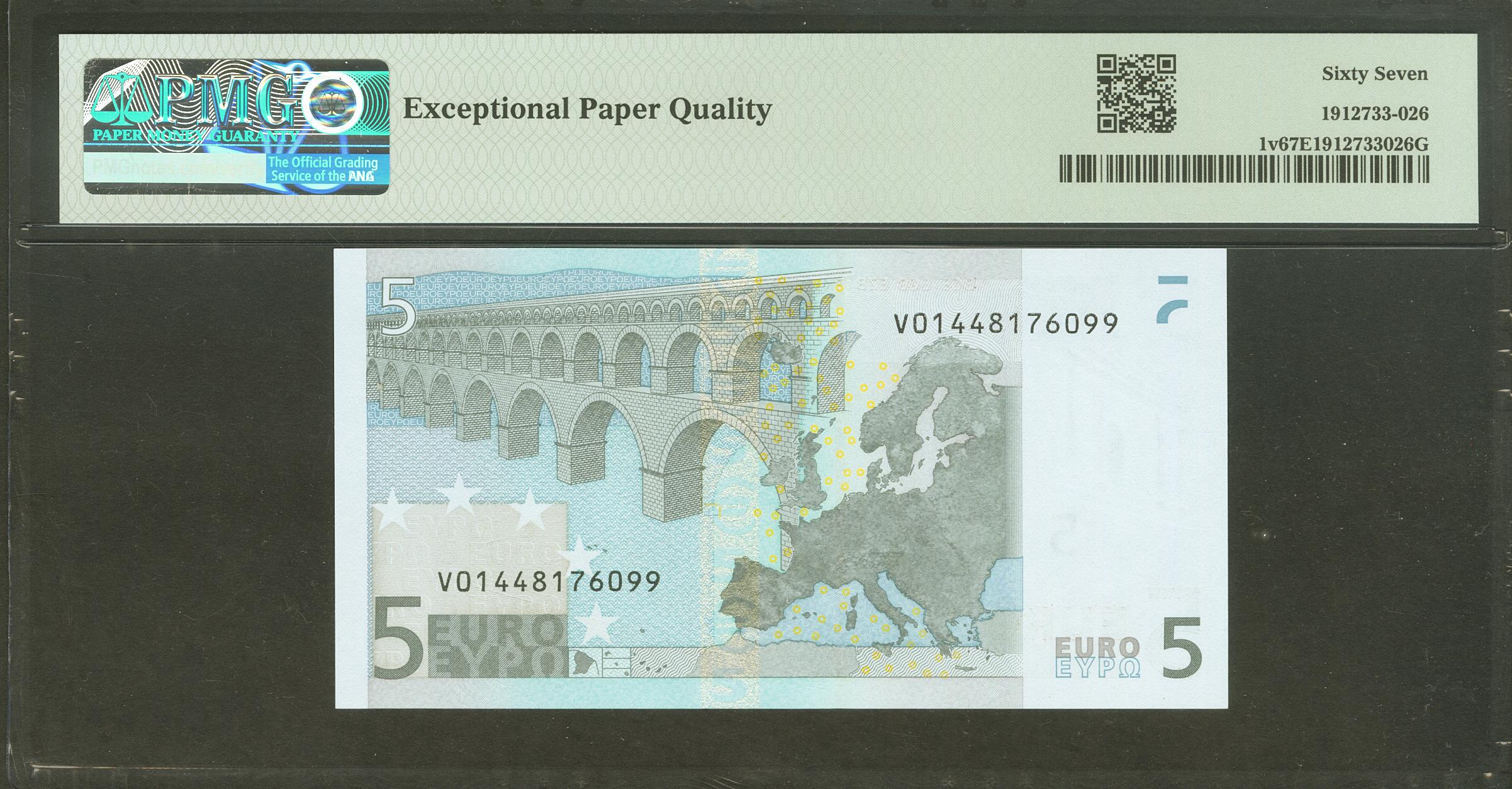5 Euros. 1 de Enero de 2002. Firma Duisenberg. Serie V (España). (Edifil 2021: 486, Pick: 1v). SC. Encapsulado PMG67EPQ.
