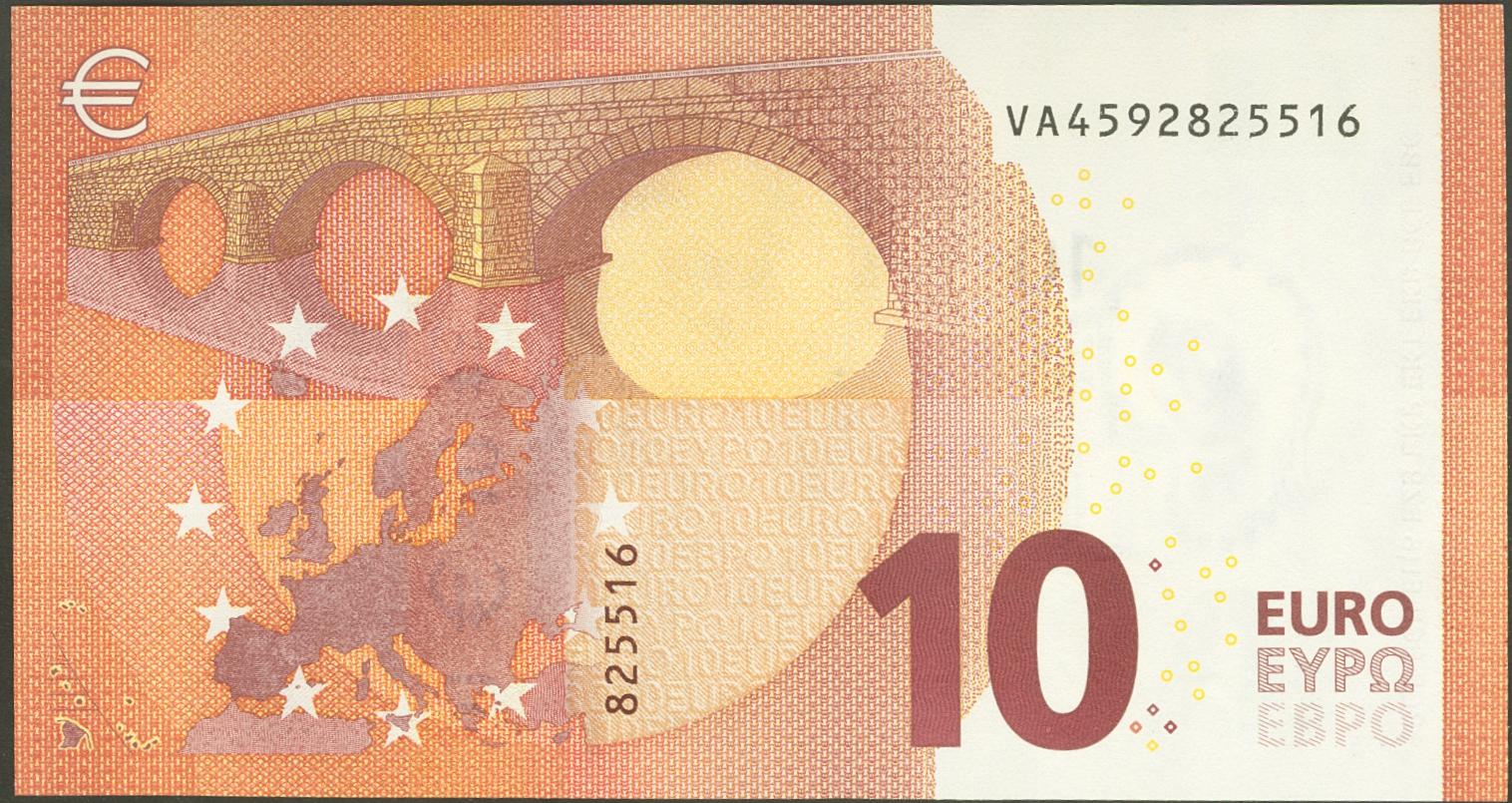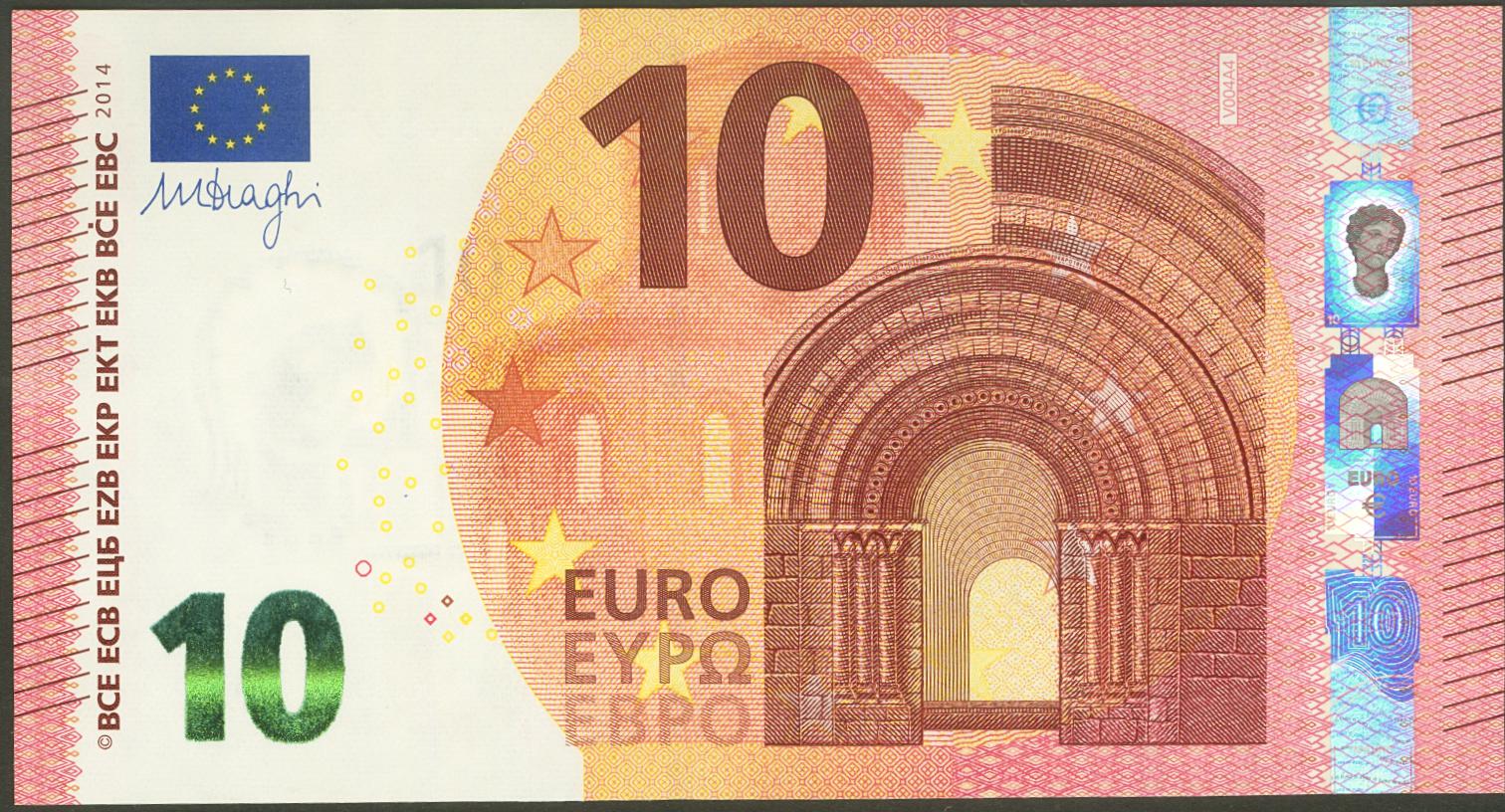 10 Euros. 23 de Septiembre de 2014. Firma Draghi. Serie V (España). (Edifil 2021: 494). Ondulación natural del proceso de fabricación (este es el único motivo de "quitarle" el SC). EBC+++.