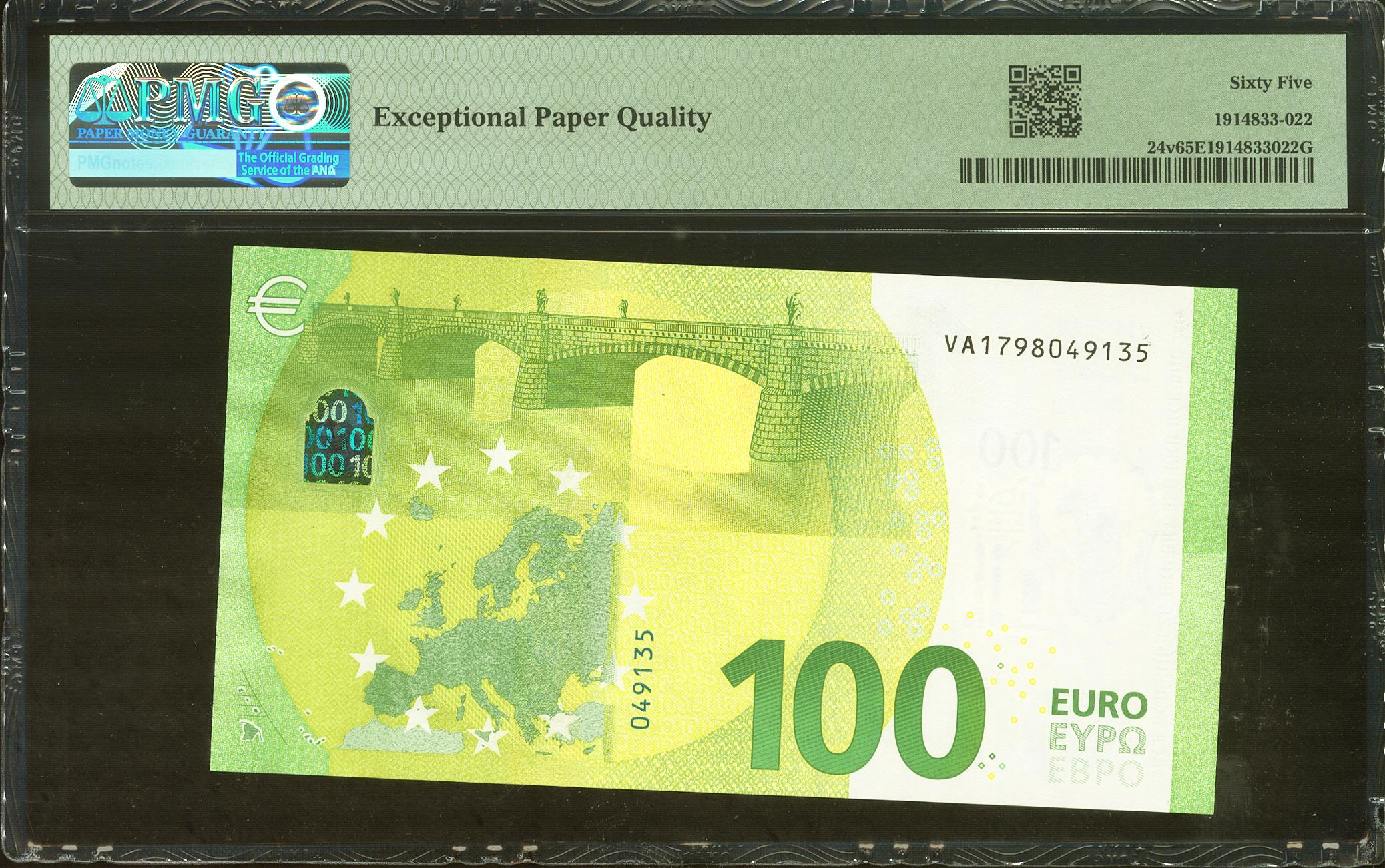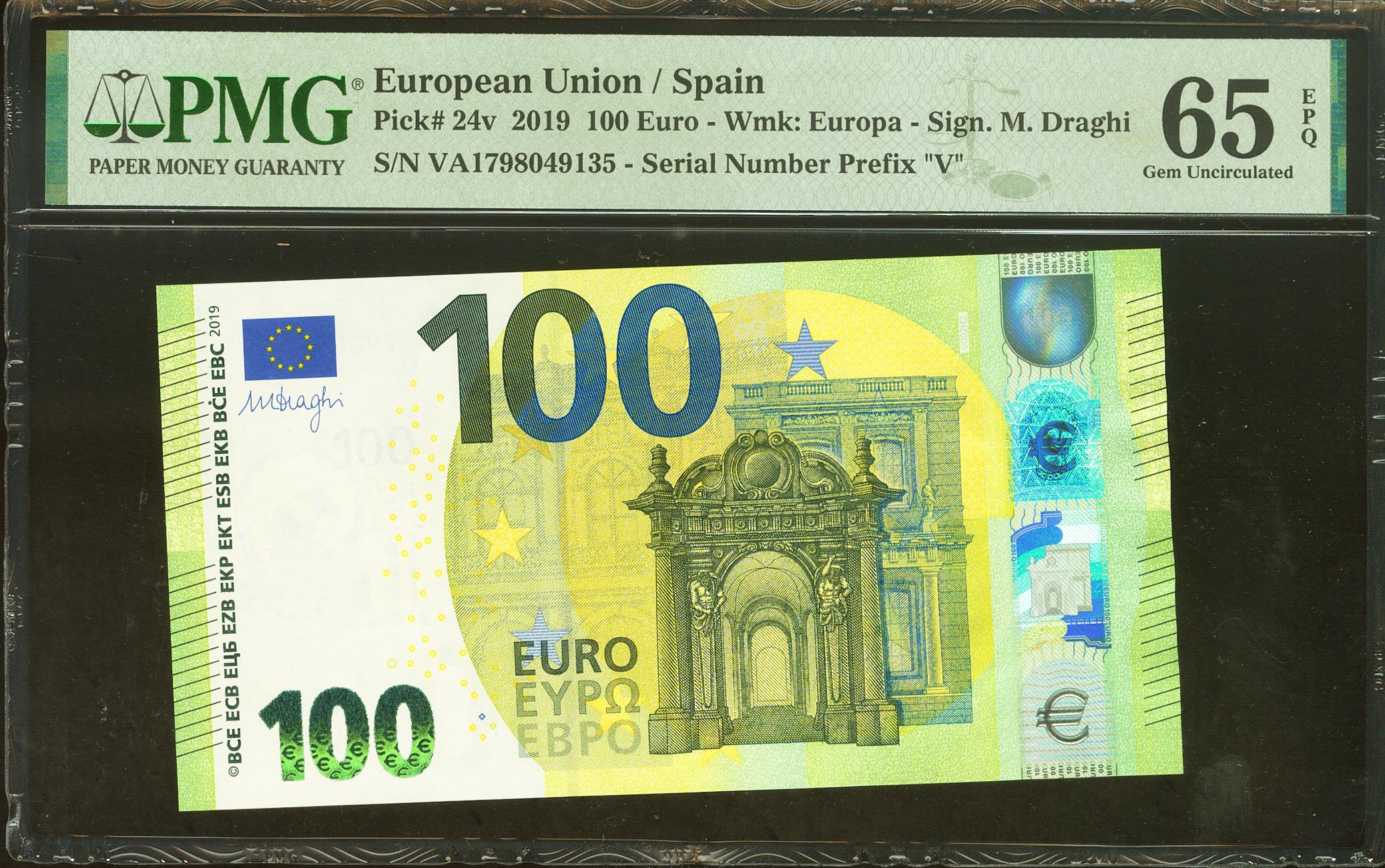 100 Euros. 2019. Firma Draghi. Serie V (España). (Edifil 2021: 497, Pick: 24v). SC. Encapsulado PMG65EPQ.