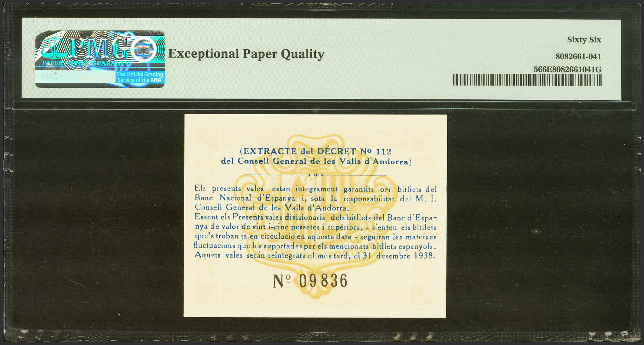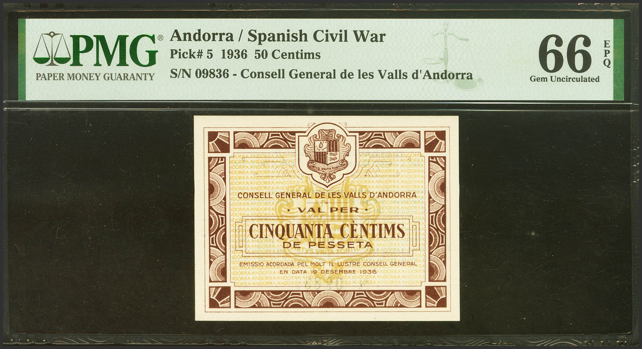 ANDORRA. 50 Centims. 19 de Diciembre de 1936. Sin serie. (Edifil 2021: 1, Pick: 5). Raro en esta excepcional calidad, apresto original. SC. Encapsulado PMG66EPQ.