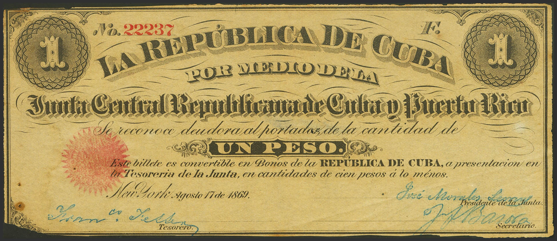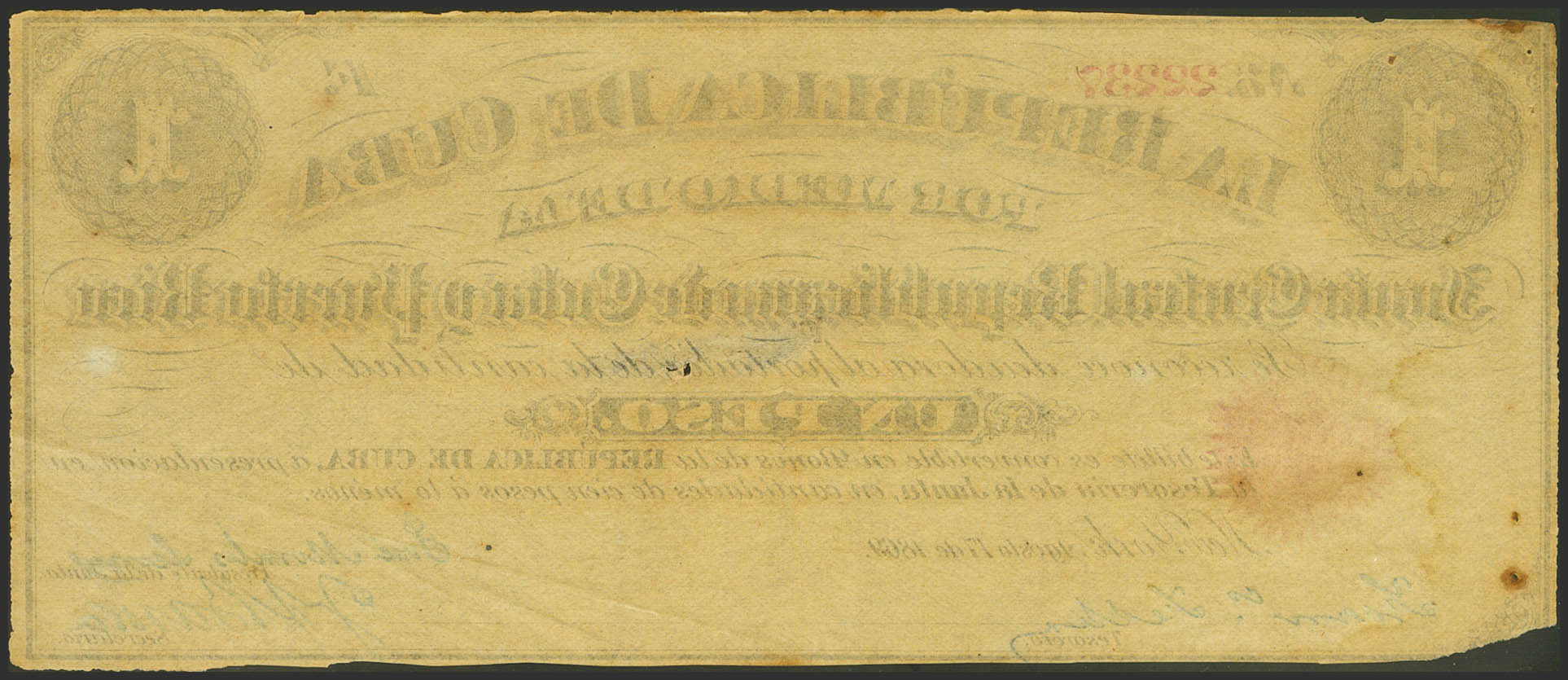 REPUBLICA DE CUBA. 1 Peso. 17 de Agosto de 1869. Serie F. (Edifil 2021: 35). Puntitos de "polilla" y falta en la esquina inferior izquierda. MBC+.