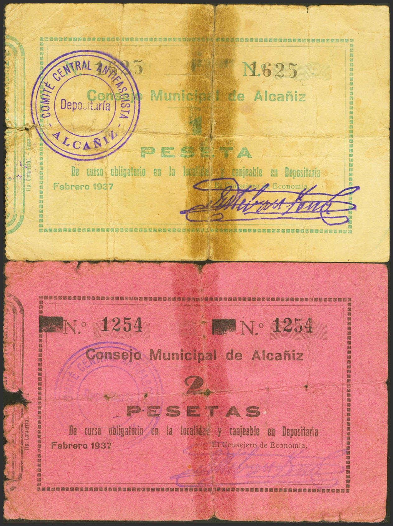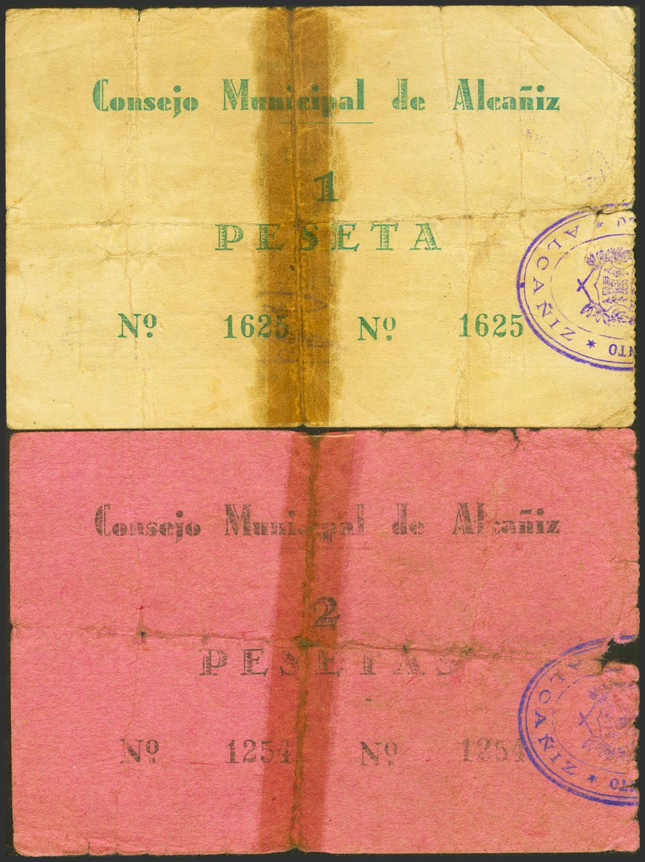 ALCAÑIZ (TERUEL). 1 Peseta y 2 Pesetas. Febrero 1937. (González: 295/96). Inusual serie completa reforzada con cinta adhesiva. RC+.