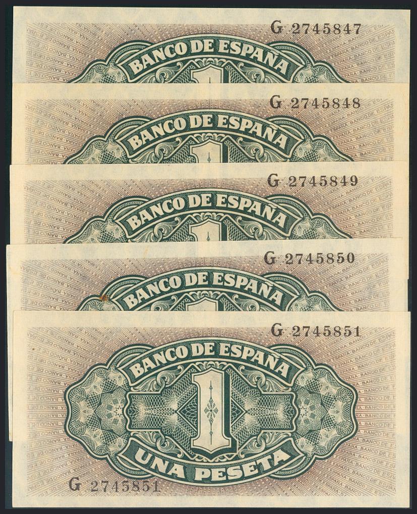Conjunto de 5 billetes correlativos de 1 Peseta emitidos el 4 de Septiembre de 1940, serie G (Edifil 2017: 442a). SC.