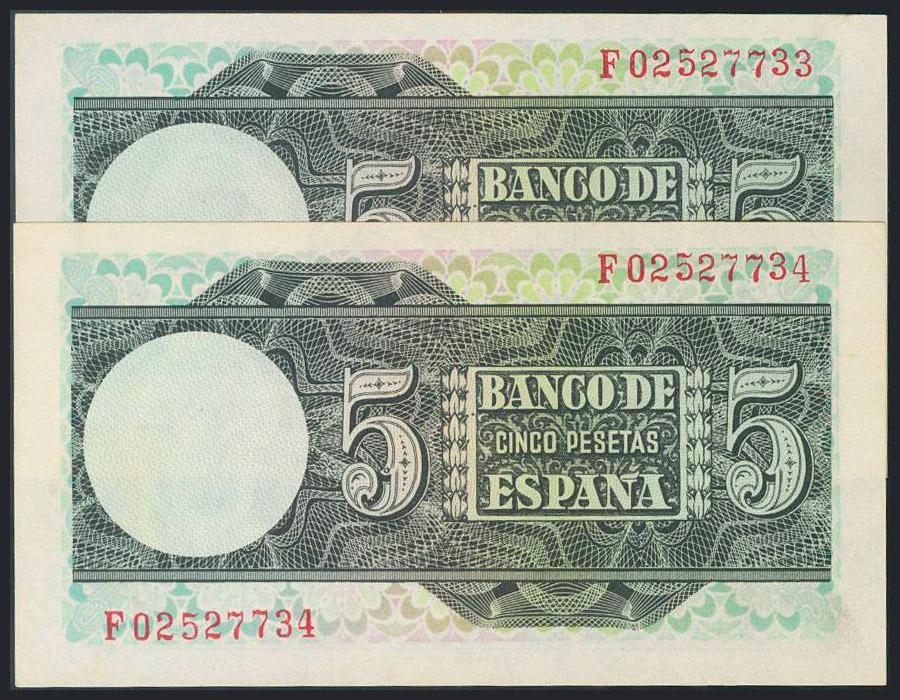5 Pesetas. 15 de Marzo de 1948. Pareja correlativa. Serie F. (Edifil 2017: 455a). SC.