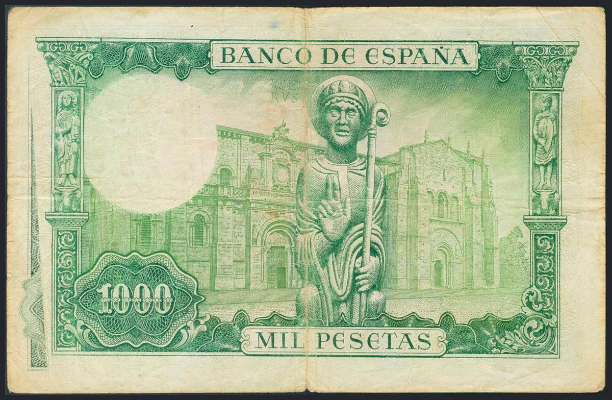 1000 Pesetas. 19 de Noviembre de 1965. Variedad de impresión en el margen izquierdo del dorso. Serie V. (Edifil 2017: 471b). Inusual. RC.