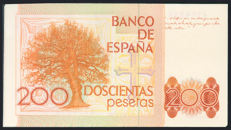 Conjunto de 5 billetes correlativos y sin serie de 200 Pesetas emitidos el 16 de Septiembre de 1980 (Edifil 2017: 480), algunos de ellos marcados con un "clip". A EXAMINAR. SC/EBC+.