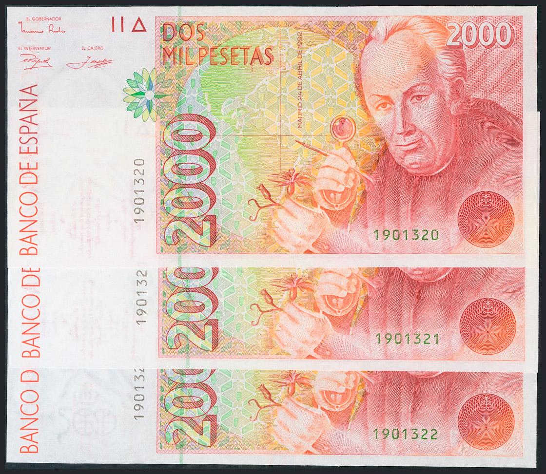 2000 Pesetas. 24 de Abril de 1992. Trío correlativo. Sin serie. (Edifil 2017: 482). SC.