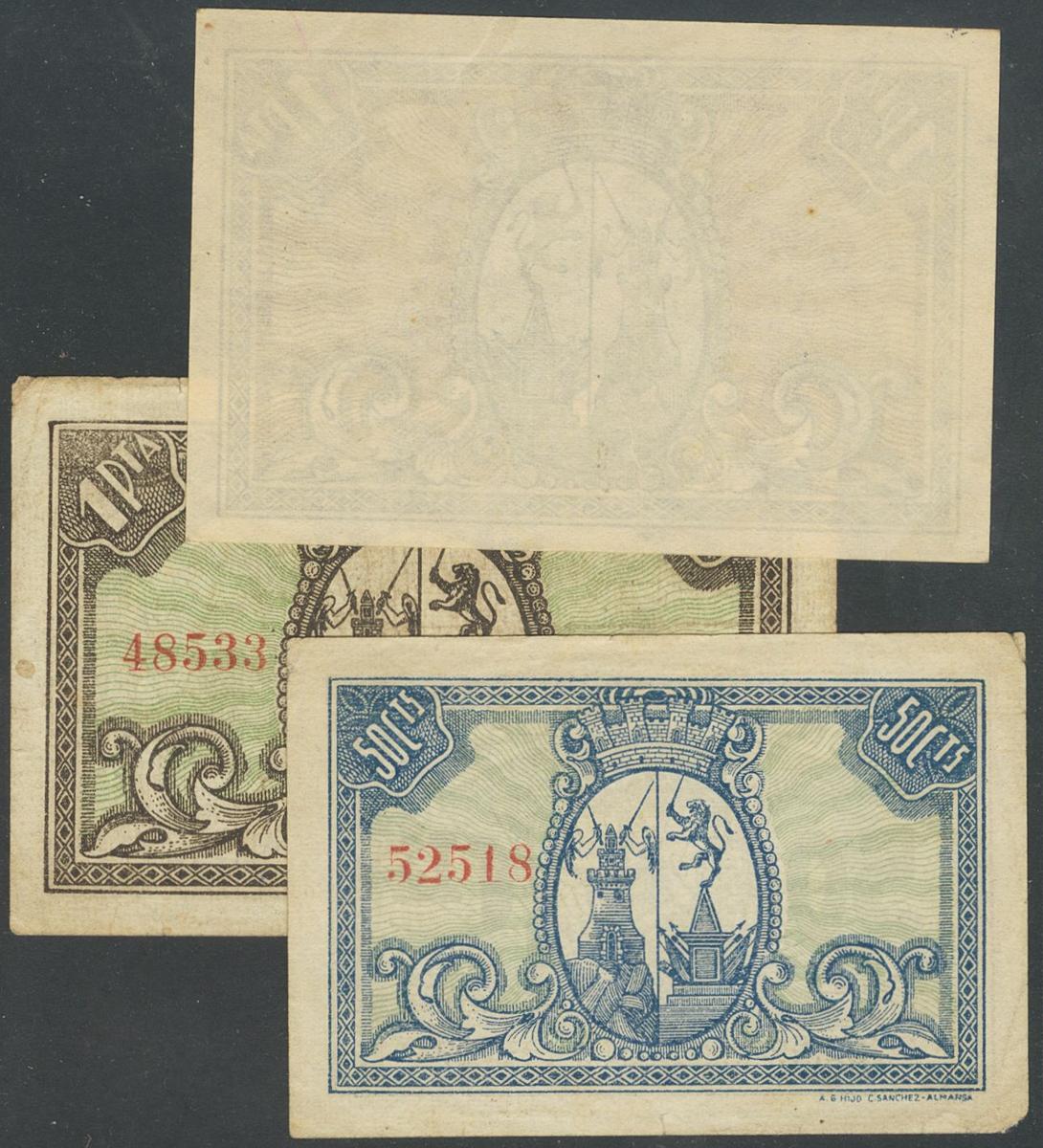 ALMANSA (ALBACETE). 50 Céntimos y 1 Peseta. (1937ca). Se incluye una prueba del reverso del 1 Peseta en color azul y marrón. Sin serie. (González: 549/50). BC.