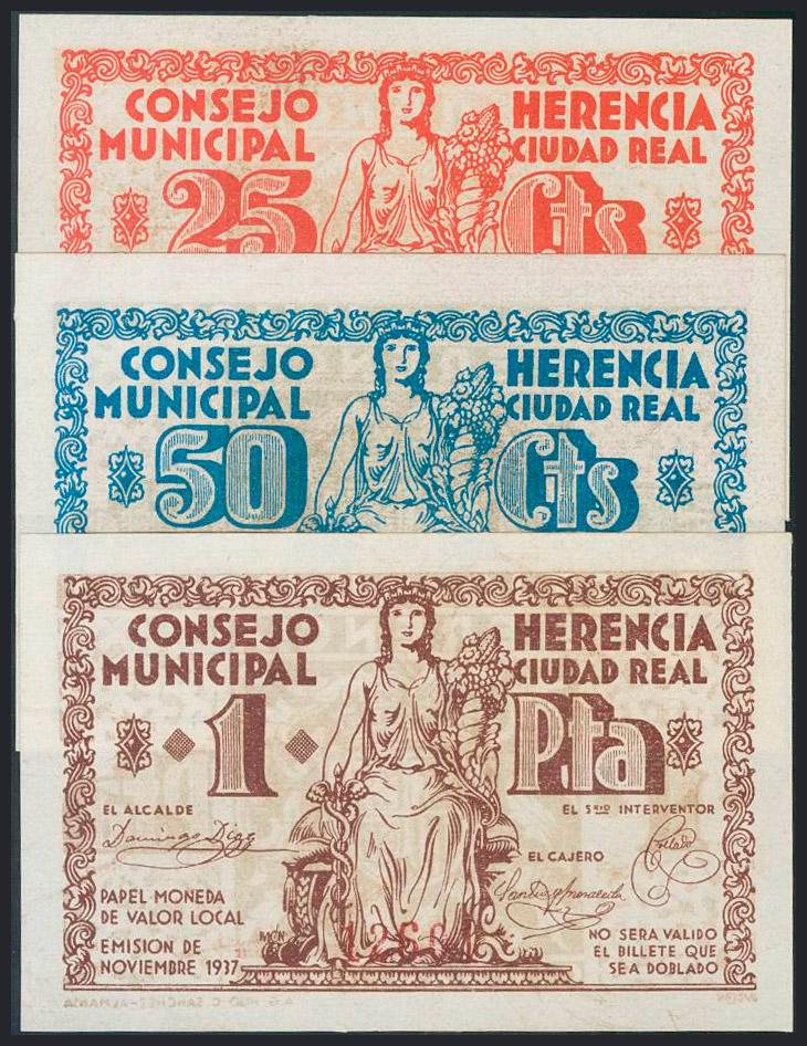 HERENCIA (CIUDAD-REAL). Serie completa del 25 Céntimos, 50 Céntimos y 1 Peseta. Noviembre de 1937. (González: 2821/23). SC.