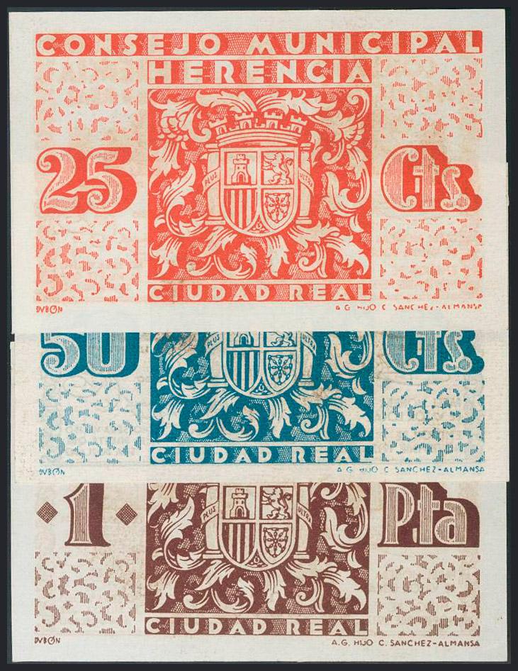 HERENCIA (CIUDAD-REAL). Serie completa del 25 Céntimos, 50 Céntimos y 1 Peseta. Noviembre de 1937. (González: 2821/23). SC.