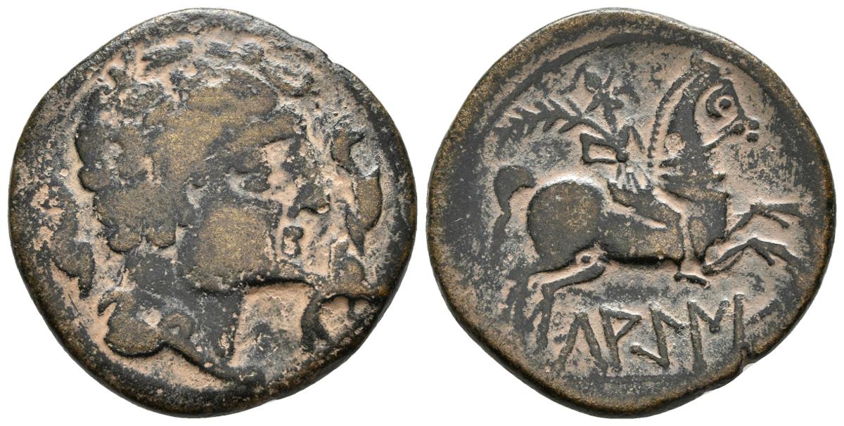 LAGINE. As. 120-20 a.C. Zona de Aragón. A/ Cabeza masculina a derecha con adornos en el cuello, rodeada de tres delfines. R/ Jinete con palma a derecha, debajo LAGiNE. FAB-1656. Ae. 9,07g. BC+/MBC+.