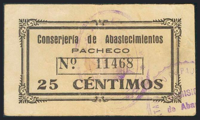PACHECO (MURCIA). 25 Céntimos. (1937ca). (González: 4019). MBC.