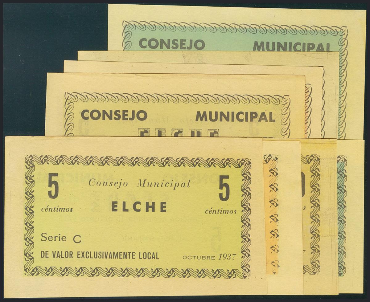 ELCHE (ALICANTE). (1936ca). Conjunto de dos series "Fantasías" del 5 Céntimos, 25 Céntimos, 50 Céntimos y 1 Peseta, respectivamente. A EXAMINAR.