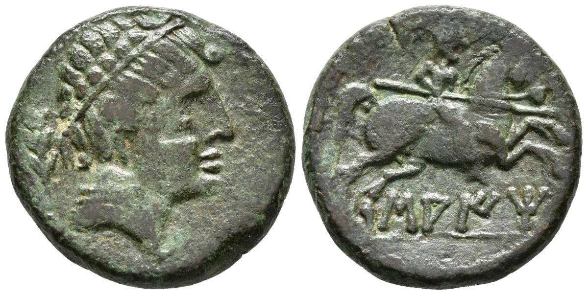 SAITI. As. 120-20 a.C. Xátiva (Valencia). A/ Cabeza masculina con manto y fíbula anular a derecha, detrás palma. R/ Jinete con lanza a derecha, debajo sobre línea, leyenda ibérica SAITI. FAB-2100. Ae. 11,76g. MBC+.