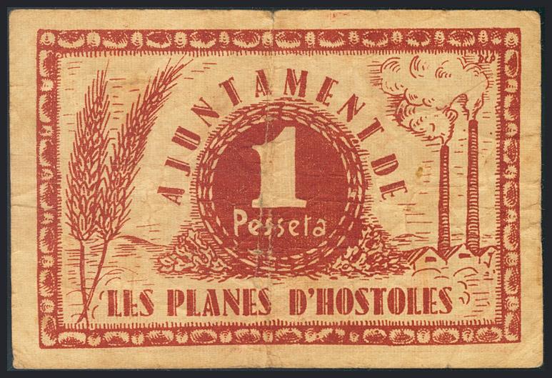 LES PLANES D´HOSTOLES (GERONA). 1 Peseta. (1937ca). (González: 9277). BC.