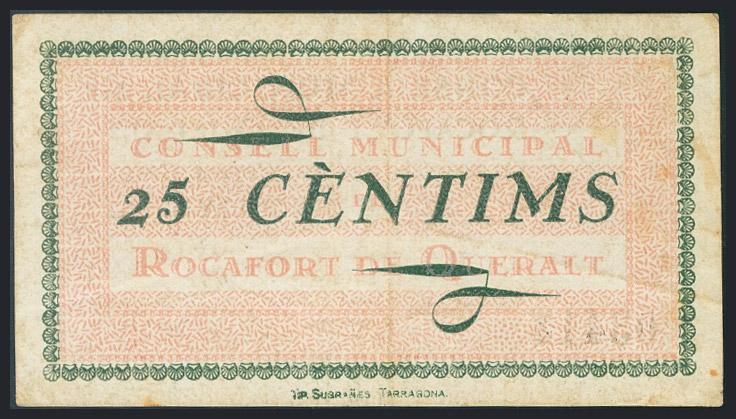 ROCAFORT DE QUERALT (TARRAGONA). 25 Céntimos. 27 de Septiembre de 1937. (González: 9705). MBC.