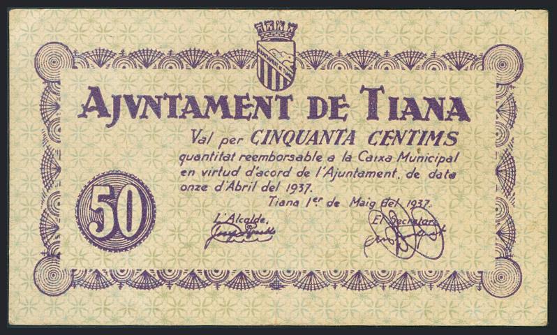 TIANA (BARCELONA). 50 Céntimos. 11 de Abril de 1937. (González: 10255). MBC.