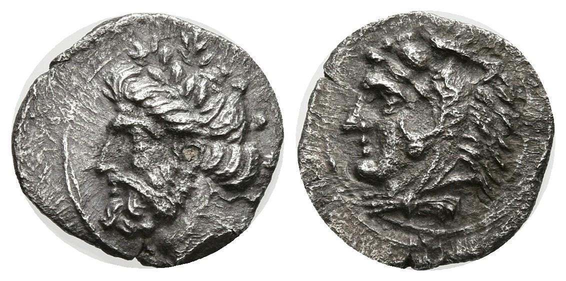 CILICIA, Incierta. Obolo. Siglo IV a.C. A/ Cabeza laureada de Zeus a izquierda. R/ Cabeza de Hércules con piel de león. SNG Levante 198-9. Ar. 0,66g. MBC+. Escasa.