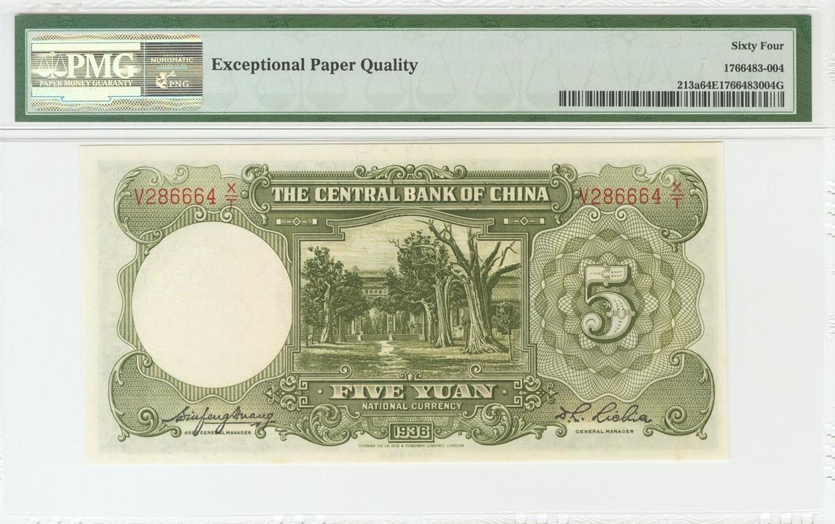 CHINA. 5 Yuan. 1936. Serie V. (Pick: 243a). Encapsulado 64EPQ.