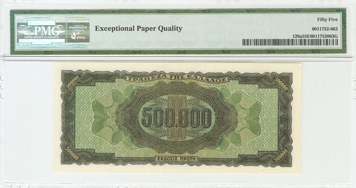 GRECIA. 500000 Dracmas. 1944. (Pick: 126a). Emitido durante la ocupación Germano-Italiana en la II Guerra Mundial. Encapsulado PMG55EPQ. EBC+.