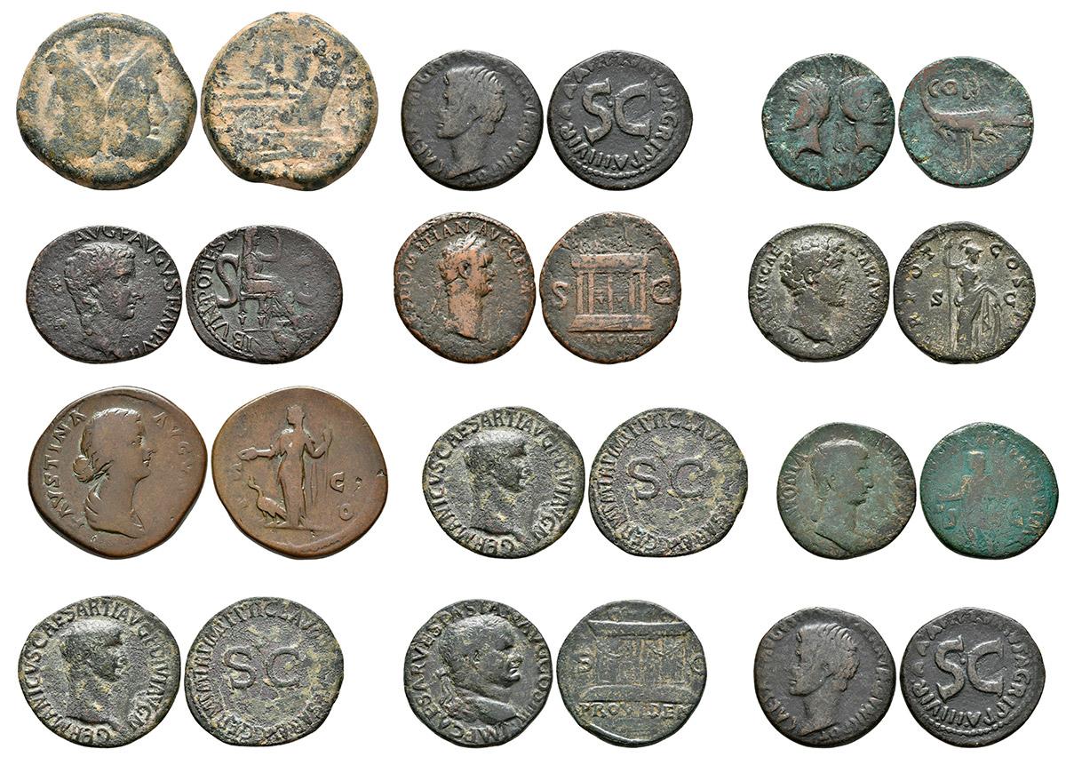 IMPERIO ROMANO. Antigua colección compuesta por 63 monedas. Contiene gran variedad de emperadores comenzando en la República Romana (3), continuando con Augusto, Tiberio, Germánico, Agripa, Antonia, Domiciano, Vitelio (Tarraco), Tito (As Judaea Capta), Vespasiano, Marco Aurelio, Comodo, Faustina, Lucilla, Filipo I, Gordiano III, Alejandro Severo, Julia Mamaea, Juliano II el apóstata, Magnencio, Galieno, Valentiniano II, Decencio, Magno Máximo, Theodosio, Arcadio, Graciano, Crispo, Constans, Aelia Flacilla, Aureliano y Vabalato, Helena, Fausta, Constantino I y Contantino II. Hay todo tipo de valores, Denario, As, Sestercio, Follis y Maiorinas. Incluye as de Colonia Nemasus. BC/MBC. A EXAMINAR.