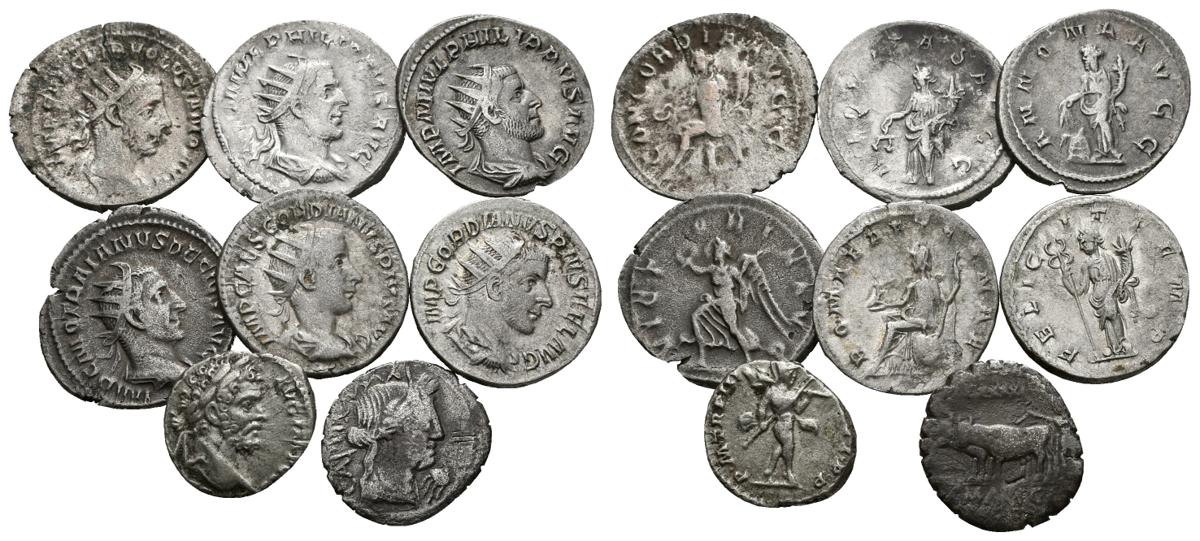 IMPERIO ROMANO. Lote compuesto por 8 Antoninianos y 2 Denarios, conteniendo: Filipo I (2); Trajano Decio; Gordiano III (2); Volusiano; Septimio Severo y C. Marius C.F. Capito. Todos diferentes. Ar. BC+/MBC+. A EXAMINAR.