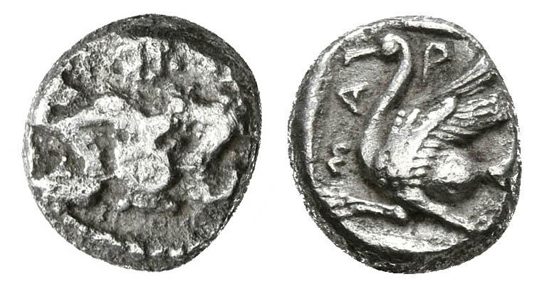 CILICIA, Mallos. Obolo. 440-390 a.C. A/ Busto alado de medio cuerpo con la cabeza a derecha sosteniendo disco. R/ Cisne estante a izquierda dentro de cuadro incuso, delante MA-P. Casabonne type 1; Göktürk 29; SNG France 374; SNG Levante 131-2. Ar. 0,81g. BC+/MBC+.
