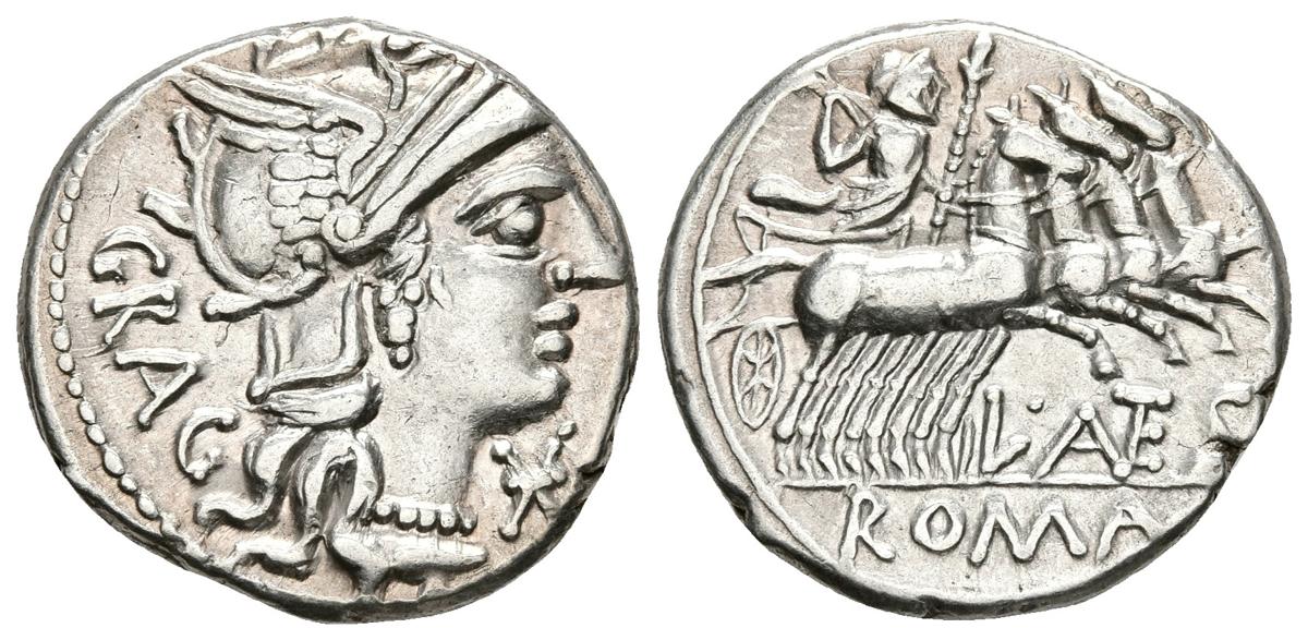 L. ANTESTIUS GRAGULUS. Denario. 136 a.C. Roma A/ Cabeza de Roma a derecha, bajo el mentón signo de valor y detrás leyenda GRAC. R/ Júpiter en cuádriga a derecha con cetro y haz de rayos. Debajo leyenda L. ANTES, en exergo ROMA. Craw 238.1. Ar. 3,88g. EBC/EBC-.