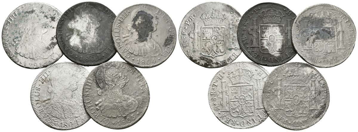 CARLOS IV. Lote compuesto por 5 monedas de 8 Reales: México 1803 FT, 1804 TH (3), 1805 TH y Potosí 1791 PR. Todos con oxidaciones marinas. Ar. BC+/MBC. A EXAMINAR.