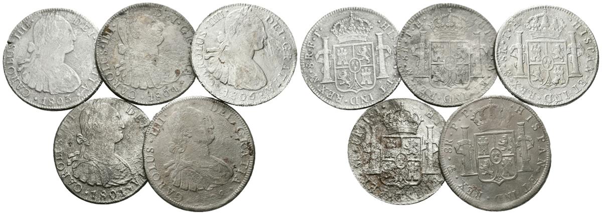 CARLOS IV. Lote compuesto por 5 monedas de 8 Reales: México 1803 FT, 1804 TH, 1805 TH; Potosí 1798 PP y Lima 1801 IJ. Todos con oxidaciones marinas. Ar. BC+/MBC. A EXAMINAR.
