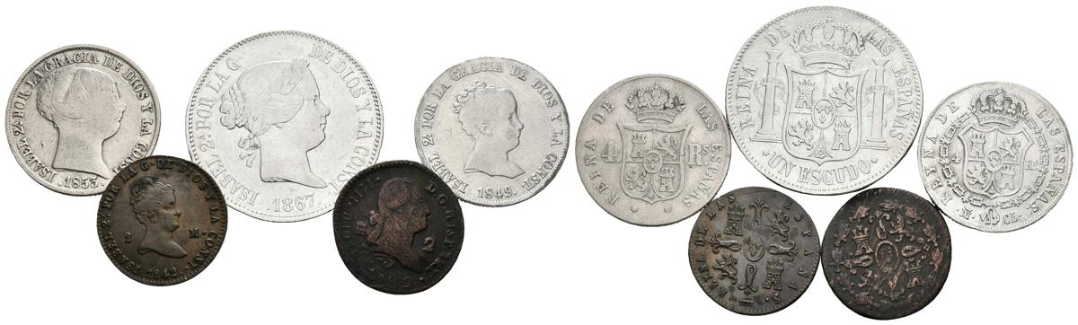 CARLOS IV e ISABEL II. Lote compuesto por 5 monedas. Conteniendo: Carlos IV. 2 Maravedís. 1789. Segovia. (Cuño empastado en la S dando lugar a la leyenda CAROLU); Isabel II. 2 Maravedís. 1842. Segovia, 4 Reales. 1849. Madrid CL, 4 Reales. 1853. Madrid y 1 Escudo. 1867. Madrid. Ae-Ar. BC+/MBC-. A EXAMINAR.