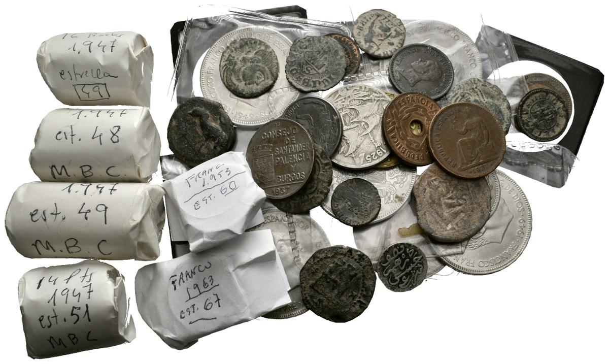 ESPAÑA VARIOS. Lote compuesto por más de un centenar de monedas de: Hispania Antigua, Imperio Romano, Edad Media, Alfonso XII, Guerra Civil, II República y Estado Español. Gran variedad principalmente en Estado Español (Peseta 1947 *48-49 y 1953 *60). BC+/SC. IMPRESCINDIBLE EXAMINAR.