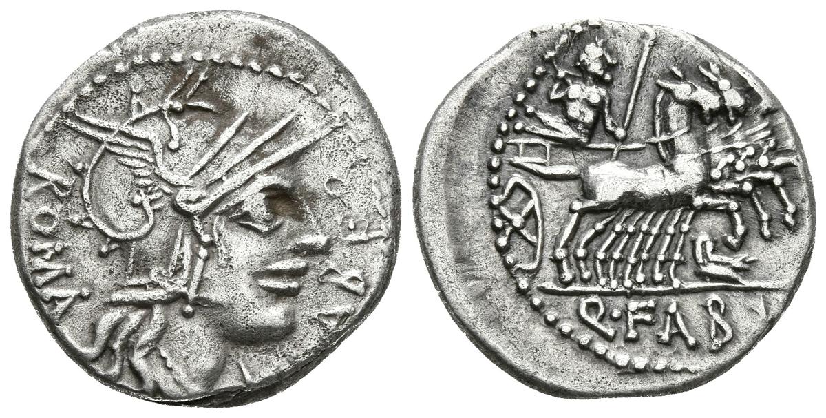 Q. FABIUS LABEO. Denario. 124 a.C. Roma. A/ Cabeza de Rom con casco a derecha, detrás ROMA, bajo la barbilla X y delante LABEO. R/ Júpiter guiando cuádriga a derecha, portando cetro y lanzando rayo, bajo la cuádriga proa de galera, en exergo Q·FABI. Craw 273.1; RSC Fabia 1. Ar. 3,82g. MBC+.