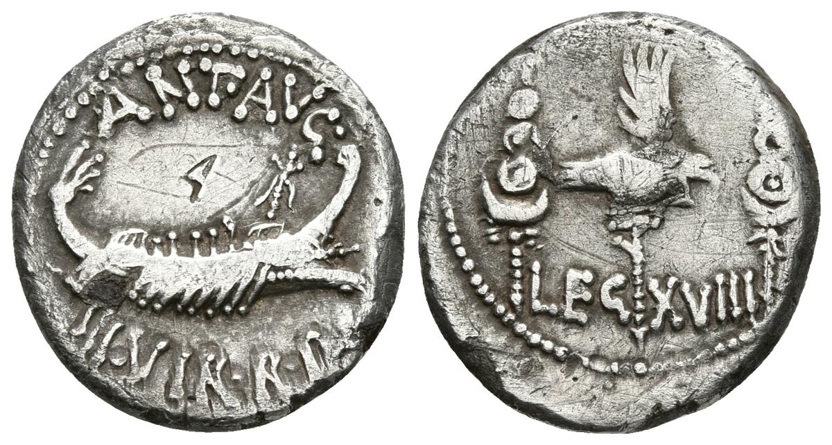 MARCO ANTONIO. Denario. 32-31 a.C. Ceca militar móvil. A/ Galera pretoriana a derecha. ANT•AVG III•VIR•R•P•C. R/ Aguila legionaria entre dos insignias militares. LEG XVIII. Craw 544.33; CRI 376; RSC 51. Ar. 2,71g. MBC.