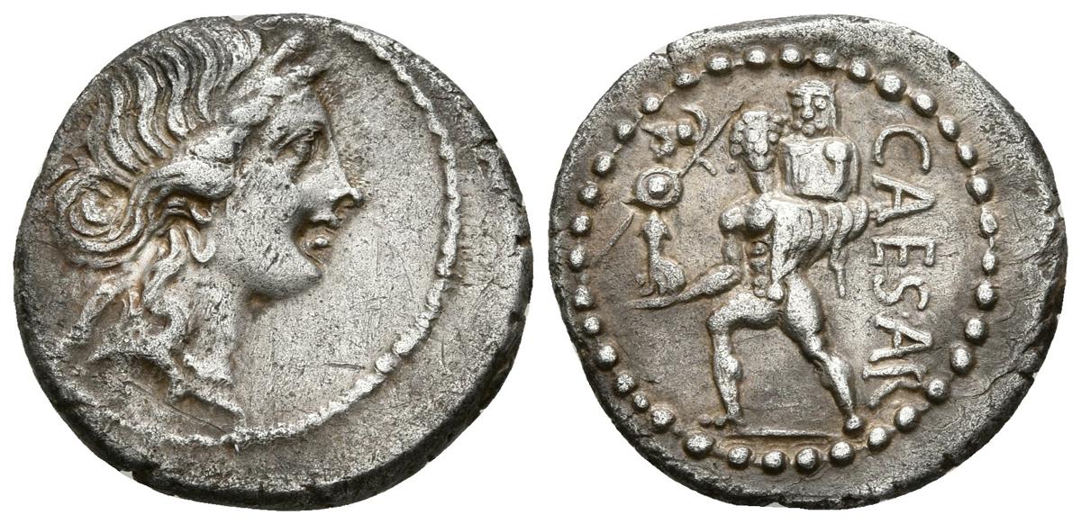 JULIO CESAR. Denario. 47-46 a.C. Ceca militar móvil acompañando a Julio César (Norte de Africa). A/ Busto de Venus con diadema a derecha. R/ Aeneas avanzando a izquierda sosteniendo paladium y llevando a Anchises sobre su hombro. Craw 458.1; Sydenham 1013; RSC 12. Ar. 3,63g. MBC+/EBC-.