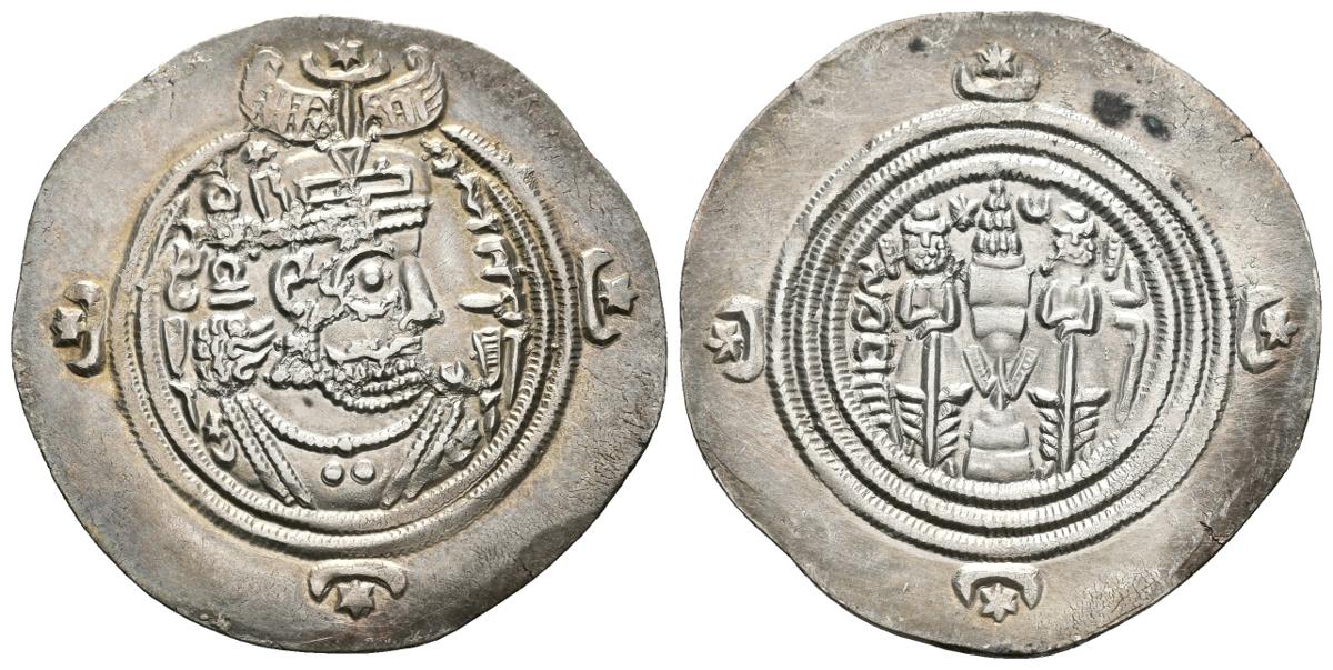 IMPERIO SASANIDA. Khusru II. Dracma. 590-628 a.C. Año 37, Ceca NY (Nihavand). A/ Busto de Khusru II a derecha con corona mural con media luna frontal, dos alas y estrella en creciente, cintas y medias lunas en los hombros, estrellas que flanquean la corona, gráfila doble, estrellas en semilunas. R/ Altar en llamas flanqueado por dos asistentes, estrellas, gráfila triple y estrellas en crecientes en el margen. Göbl II/2. Ar. 4,02g. Bonita pátina. EBC.