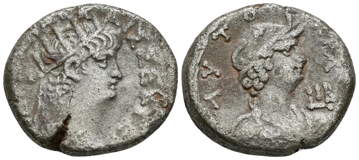 NERON. Tetradracma. Año 12 (65-66). Egipto. A/ Busto radiado y con égida a derecha. R/ Busto de Alejandría drapeado con tocado y piel de elefante a derecha. RPC 5289; Emmett 109. Ve. 10,29g. MBC.