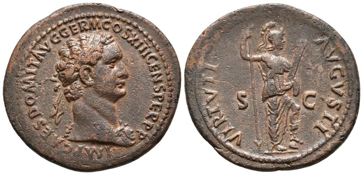 DOMICIANO. As. 88-89 d.C. Roma. A/ Cabeza laureada a derecha llevando aegis. IMP CAES DOMIT AVG GERM COS XIII CENS PER P P. R/ Virtus estante a derecha portando lanza y parazonium. VIRTVTI AVGVSTI, en exergo S-C. RIC 550. Ae. 10,54g. MBC+.