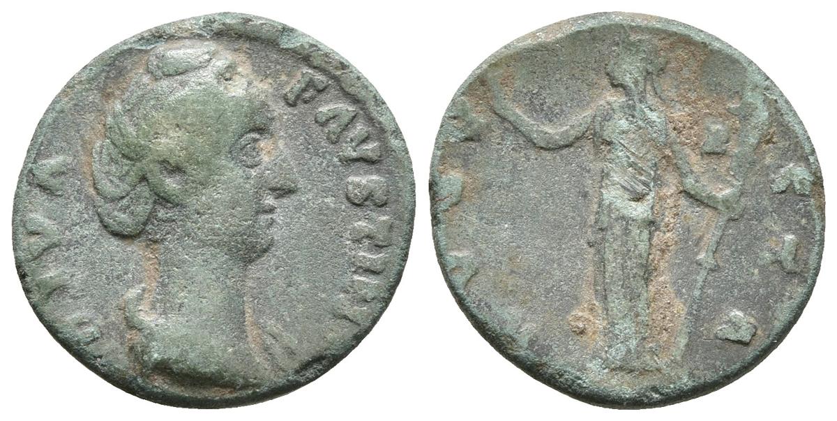 FAUSTINA I. Ae, Limes Denario. 141 d.C. Roma. A/ Busto drapeado a derecha. DIVA FAVSTINA. R/ Ceres estante a izquierda con mano derecha alzada y portando antorcha. AVGVSTA. RIC 361; BMC 417. Ae. 1,68g. MBC-.