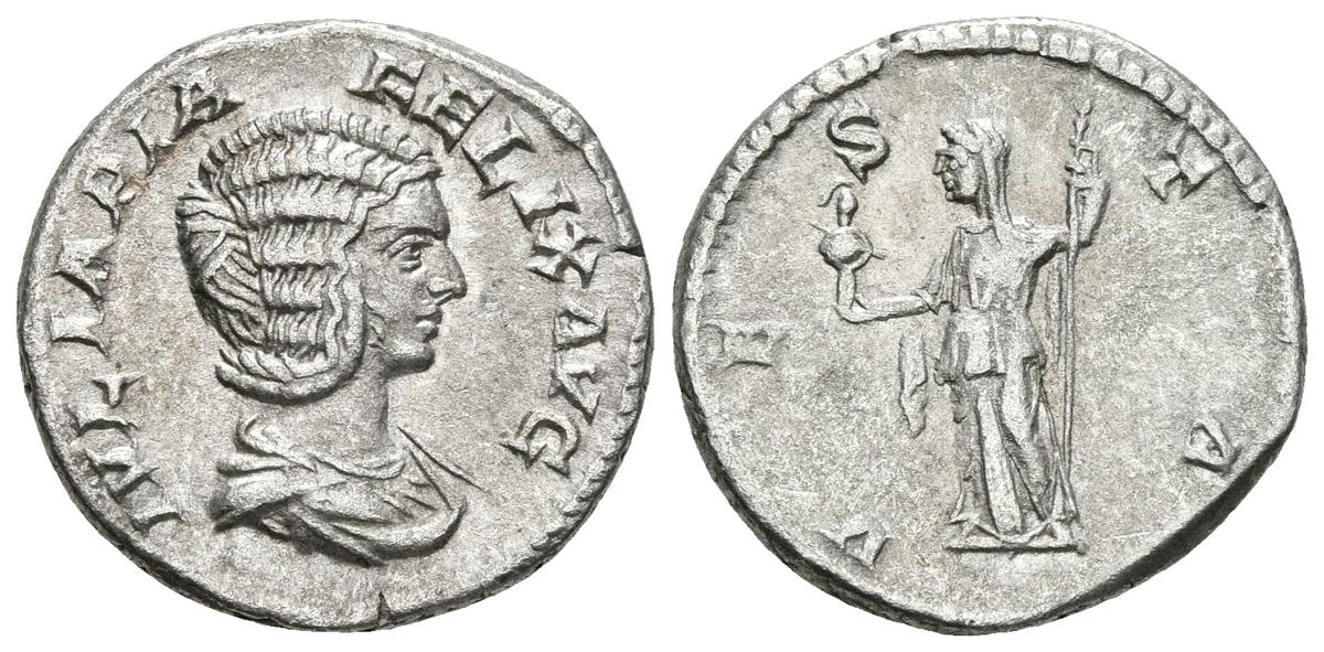 JULIA DOMNA. Denario. 211-217 d.C. Roma. A/ Busto drapeado a derecha. IVLIA PIA FELIX AVG. R/ Vesta estante a izquierda portando Palladium y cetro. VESTA. RIC 390; Cohen 230; BMC 29. Ar. 3,61g. MBC+.