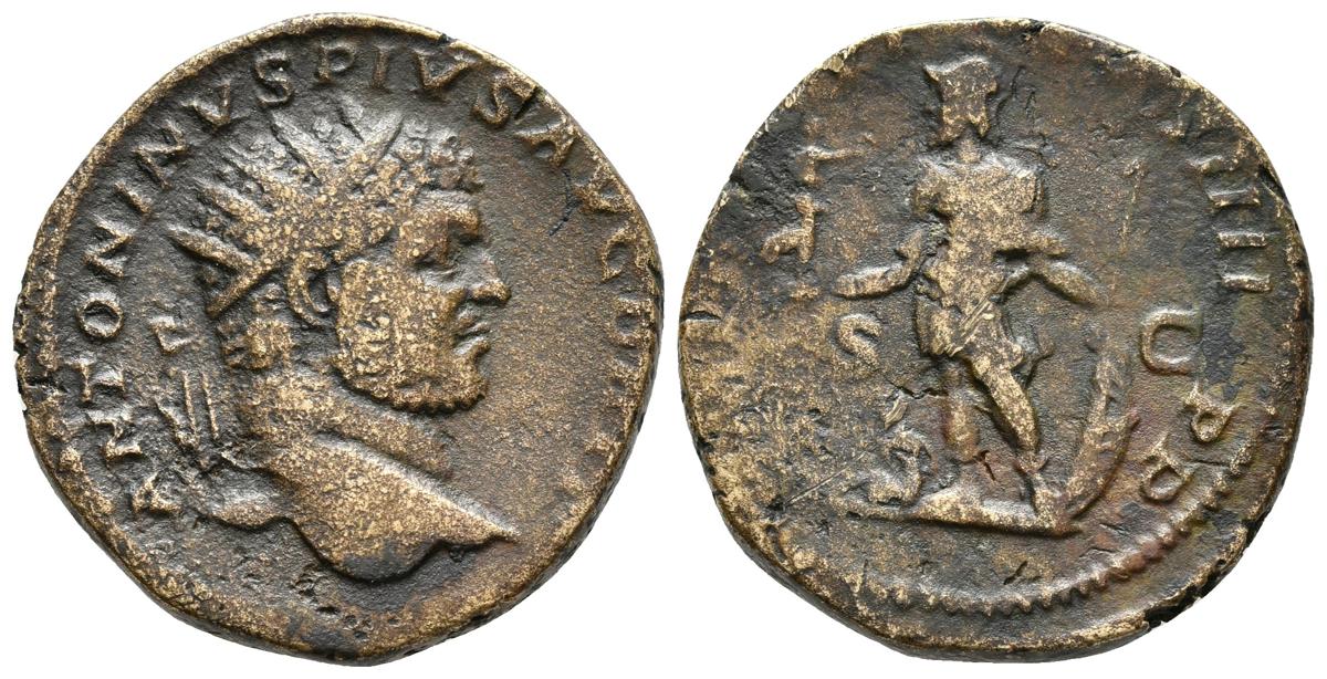 CARACALLA. Dupondio. 198-217 d.C. Roma. A/ Busto radiado a derecha. ANTONINVS PIVS AVG BRIT. R/ Marte estante a izquierda portando Victoria, lanza y escudo, a sus pies cautivo. P M TR P XVI COS IIII P P. BMC 254; Cohen 219; RIC 501. Ae. 8,51g. MBC-. Rara.