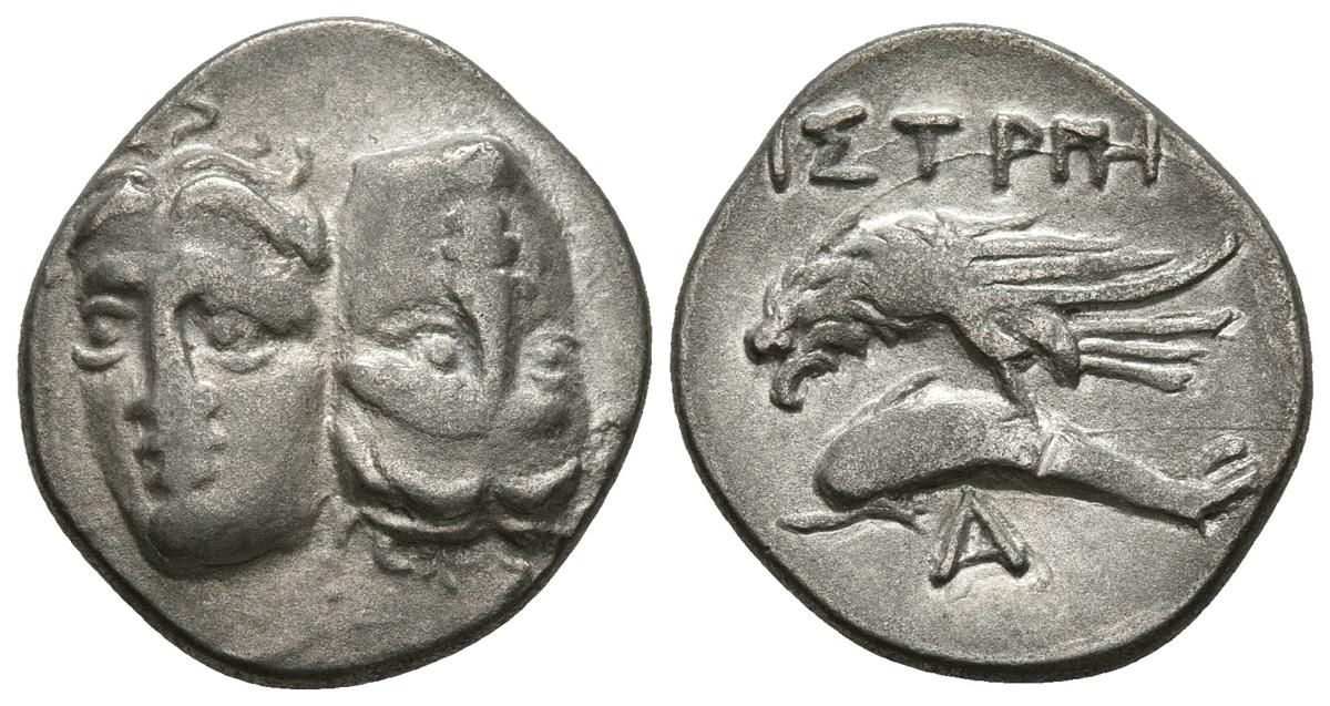 ISTROS, Moesia. 400-350 a.C. A/ Dos cabezas de jóvenes masculinos enfrentados ¿Dióscuros?, una junto a la otra en posición vertical invertidas. R/ Aguila marina a izquierda atacando un delfín, debajo monograma. SNG Cop. 200. Ar. 4,27g. Bonita pátina. MBC+.