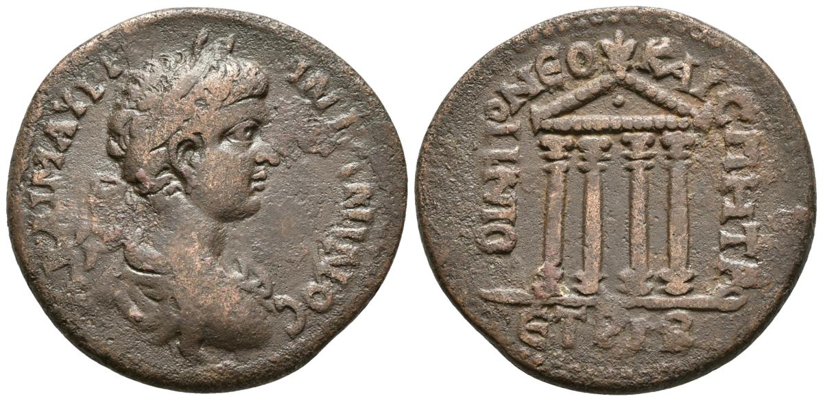 CARACALLA. Ae30. 198-217 d.C. Neocaesarea, Pontos. A/ Busto lureado y drapeado a derecha. R/ Templo tetrástilo, en exergo ET PMR. SNG Copenhagen 212var; BMC 7var. Ae. 13,59g. MBC/MBC+.