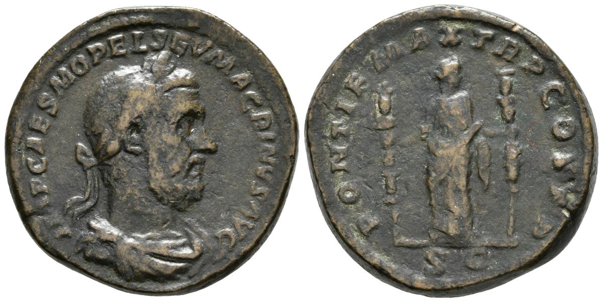 MACRINO. Sestercio, COPIA PADUANA. 1500-1570. A/ Busto laureado y drapeado con coraza a derecha. IMP CAES M OPEL SEV MACRINVS AVG . R/ Fides estante a derecha portando dos estandartes. RIC 123 (Paduan). Ae. 23,32g. MBC.