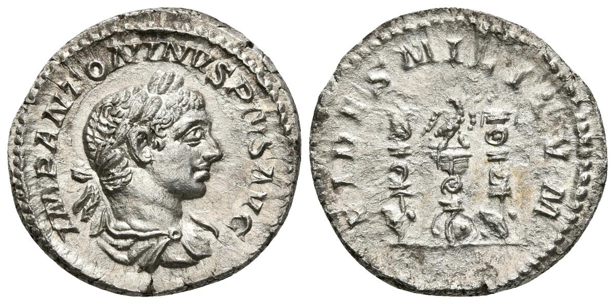 HELIOGABALO. Denario. 218-222 d.C. Roma. A/ Busto laureado y drapeado con coraza a derecha. IMP ANTONINVS PIVS AVG. R/ Aquila entre dos estandartes con escudos en sus bases. FIDES MILITVM. RIC IV 78; RSC 44. Ar. 3,03g. Plata algo agria. EBC/MBC+.