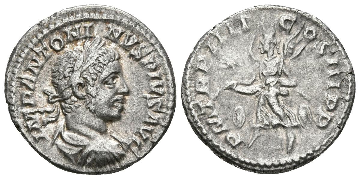 HELIOGABALO. Denario. 218-222 d.C. Roma. A/ Busto laureado y drapeado con coraza a derecha. IMP ANTONINVS PIVS AVG. R/ Victoria avanzando a izquierda portando corona abierta, detrás dos escudos, en el campo izquierdo estrella. P M TR P IIII COS III P P. RIC 45. Ar. 3,23g. MBC+.