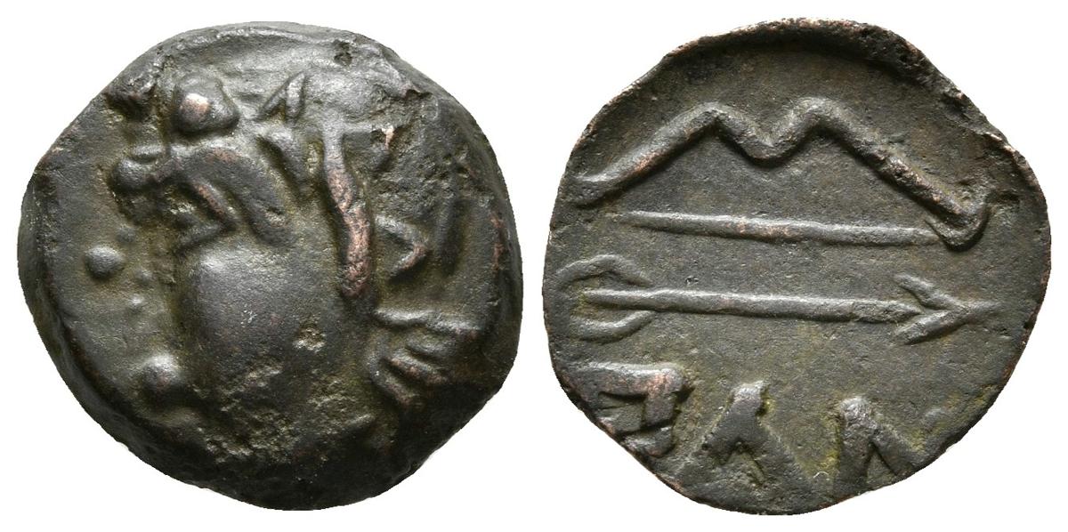 PANTIKAPAION. Ae15. 325-310 a.C. Bosporos. A/ Cabeza de sátiro sin barba a izquierda. R/ Arco sobre flecha, debajo nAN. MacDonald 116/1; SNG BM Black Sea 894. Ae. 2,06g. MBC+.