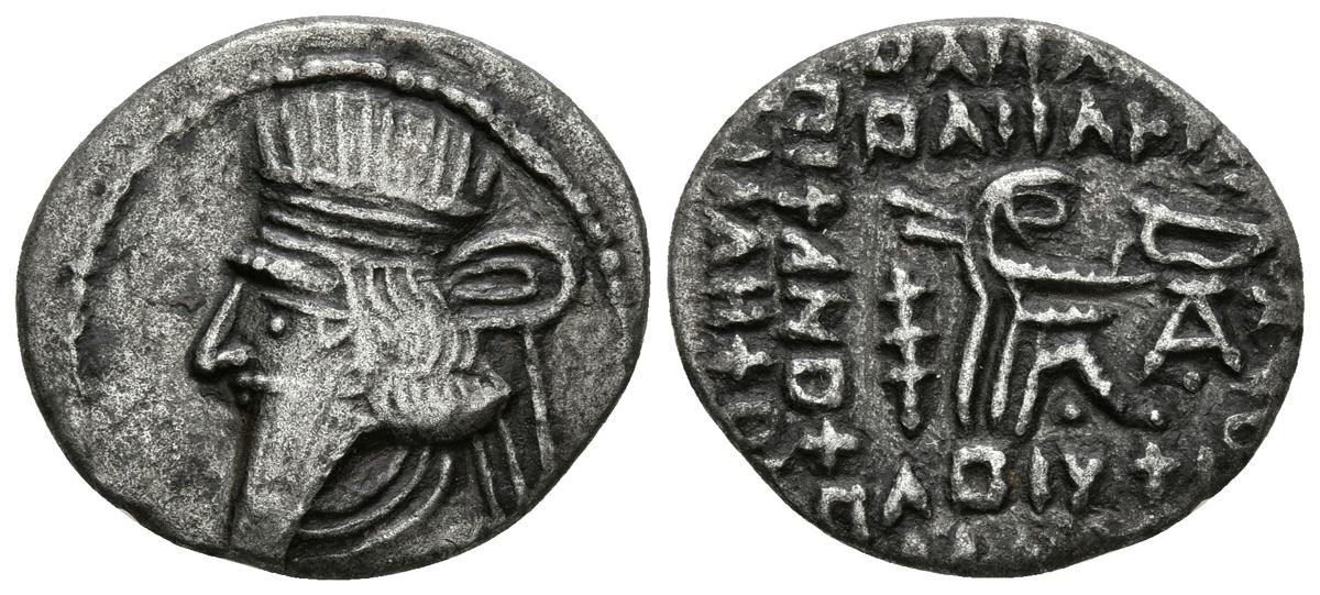 PAKOROS I. Dracma de imitación. 78-120 a.C. Ekbatana (Reino Parto). A/ Busto diademado con tiara y drapeado a izquierda. R/ Arquero sentado a derecha sosteniendo arco. Sellwood 78.3 (Vologases III). Ar. 3,02g. MBC+.