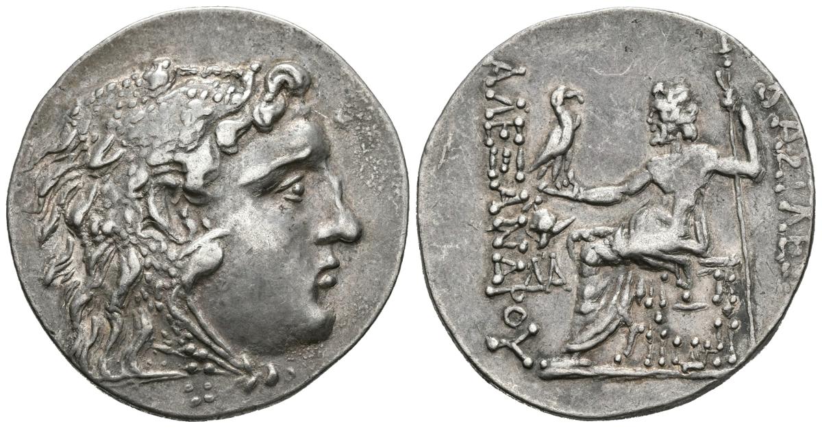 REINO DE MACEDONIA. Alejandro III Magno. Tetradracma. 175-125 a.C. Mesembria. A/ Cabeza de Herakles con piel de león a derecha. R/ Zeus sedente a izquierda portando águila y cetro, delante casco sobre monograma, debajo del trono monograma. Karayotov I 223 (O65/R217); Price 1060; HGC 3, 1568. Ar. 16,59g. MBC+.