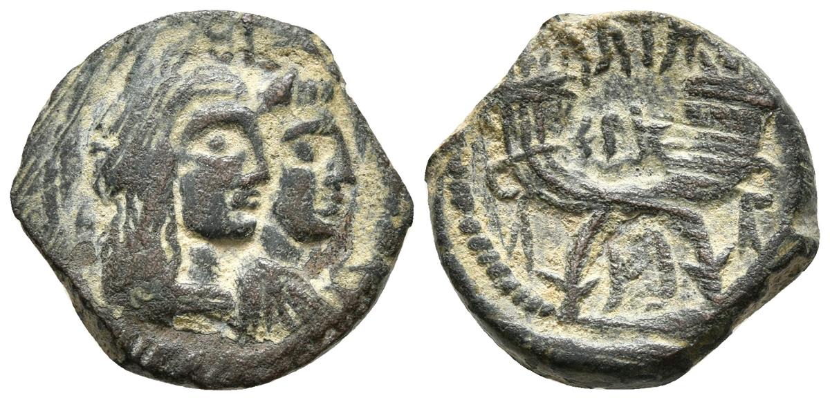 REINO NABATEO. Aretas IV con Shaqilath I. Ae. 9 A.C.-40 d.C. Petra. A/ Bustos drapeados de Aretas con pelo largo y corona junto a Shaqilah. R/ Doble cornucopia. BMC 14-22; S. GIC. 5699. Ae. 4,48g. MBC+. Escasa así.